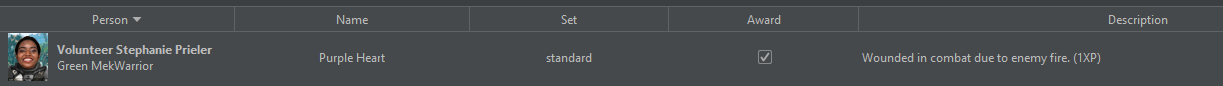 Apart from bad news, we have some good ones. Honors are due, and some of our personnel will receive their first awards. This is where the autoawards system comes in, checking if sufficient criteria have been fulfilled. In our case, we are ready to pin some ribbons on the uniforms of our comrades who saw combat for the first time in their career, and, with a note of sadness, we will have to also pin some Purple Hearts on field jackets of pilots who got injured in combat. The medals award extra XP (as set up in 3.1.2).